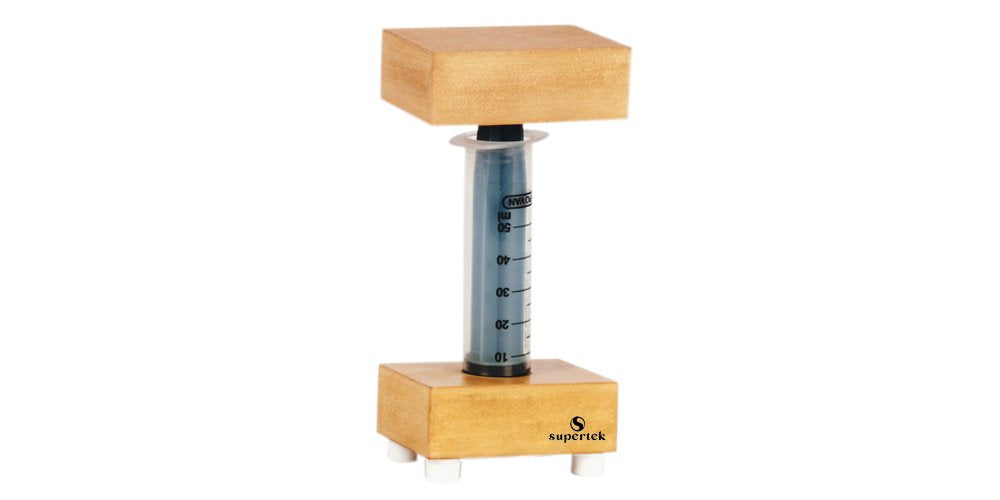 Consists an air tight plastic syringe supported between two wood blocks. Placing various weights on the upper block compresses the gas, allowing pressure and volume measurements to be made to verify Boyles Law.