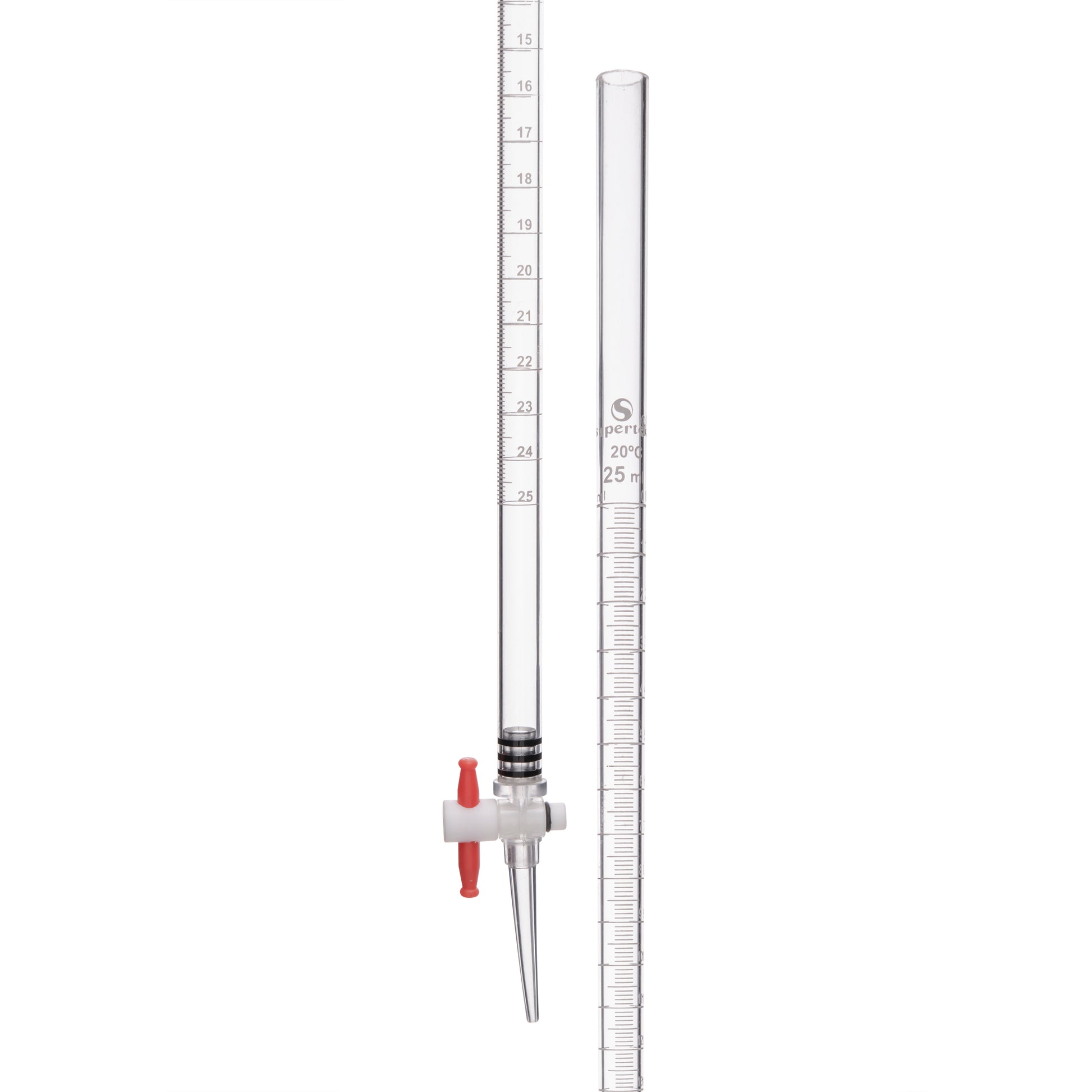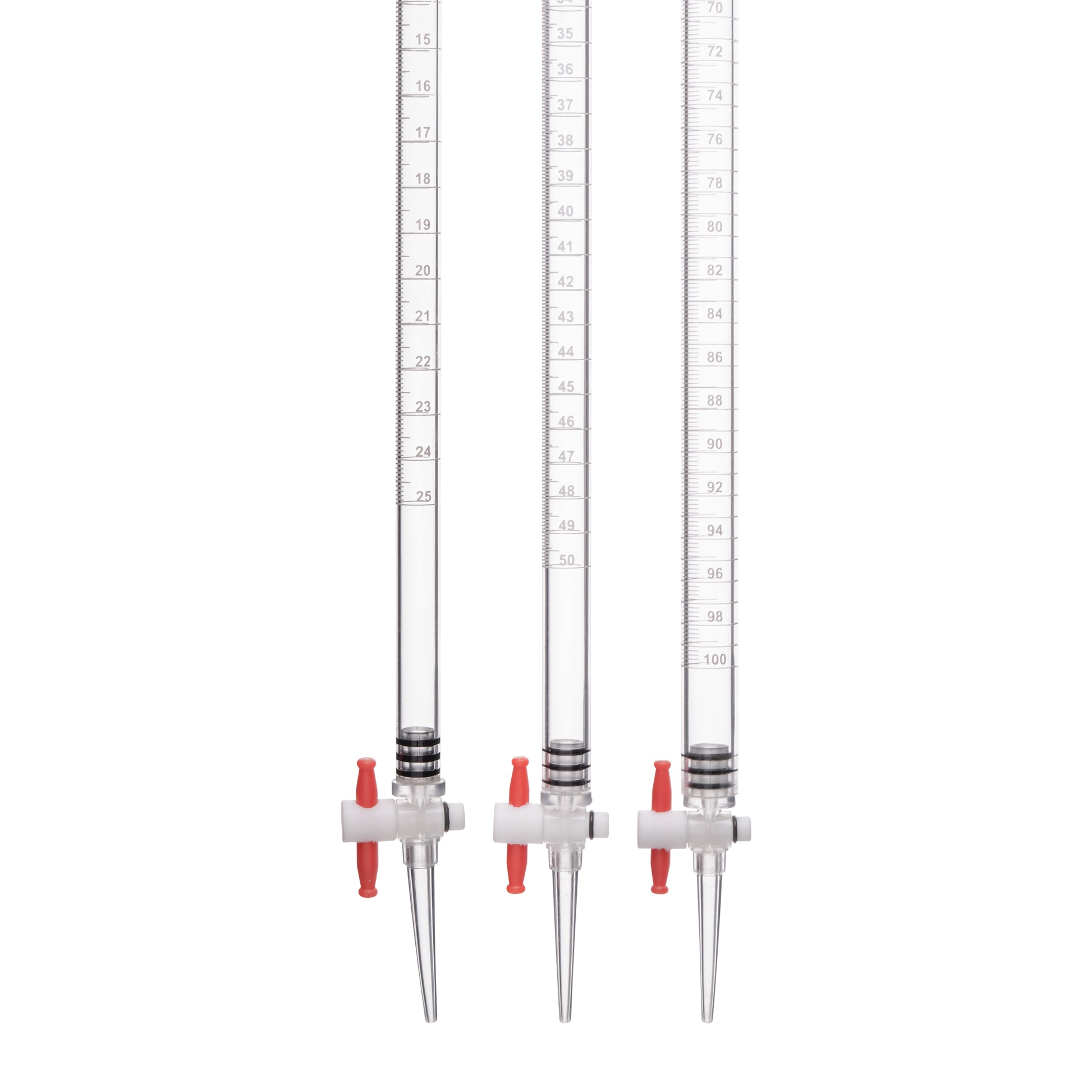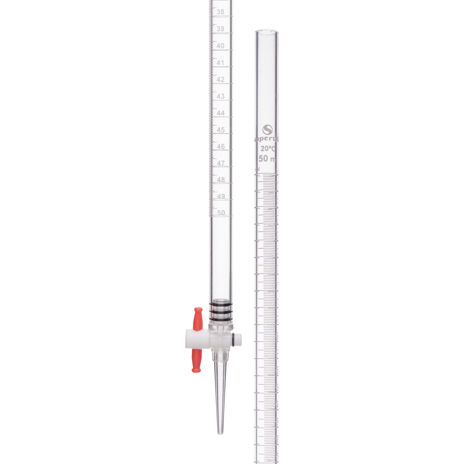 Transparent acrylic body and a leakproof stopcock fitted with a self-lubricating PTFE plug. Each Burette is individually calibrated to give maximum accuracy. Acrylic body is unaffected by dilute mineral acids and bases except Hydrofluoric Acid and Ammonium Hydroxide.