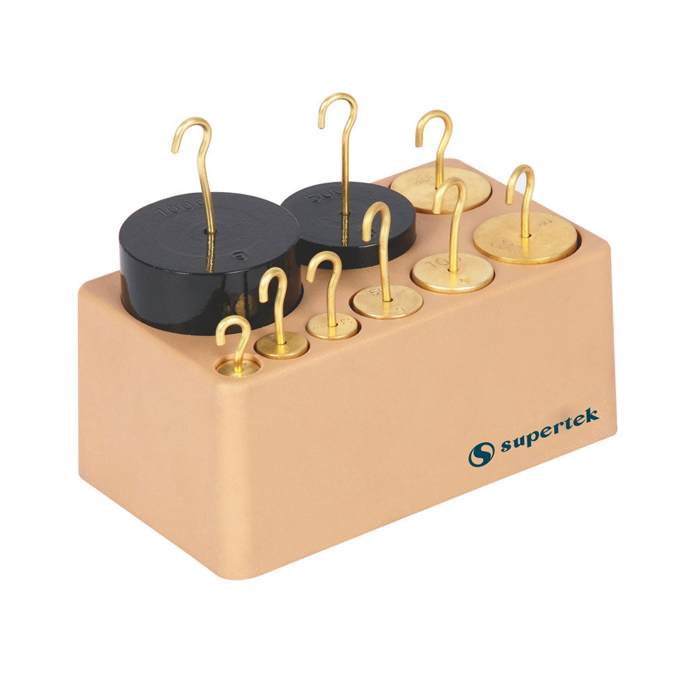 Set consists of seven polished brass weights and two black enameled weights with flat countersunk bottoms. Each weight is accurately adjusted and the value is clearly indicated. Individual masses are as follows: 1 x 10 gm, 2 x 20 gm, 1 x 50 gm, 1 x 100 gm, 2 x 200 gm, 1 x 500 gm, 1 x 1000 gm.