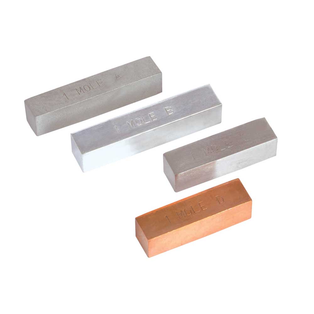 The four specimens in this set help the students to explain the concept of the mole. The Mole set contains four element specimens: Copper, Iron, Zinc 23, and Aluminum. Each sample contains one mole, 6.02 X 1023 atoms of the element.