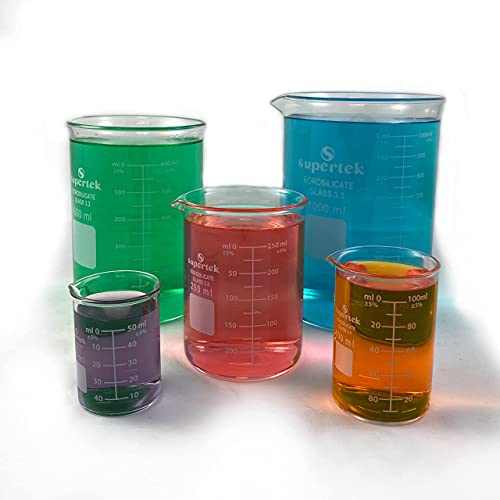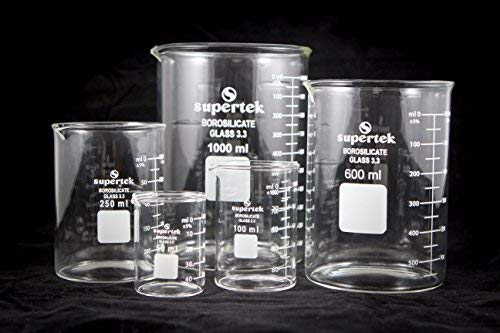 Multiple Capacity Borosilicate Glass Beaker, Low Form Griffin Thick Wall Accurate Measuring Beakers Set of 5 (50, 100, 250, 600 and 1000ml)