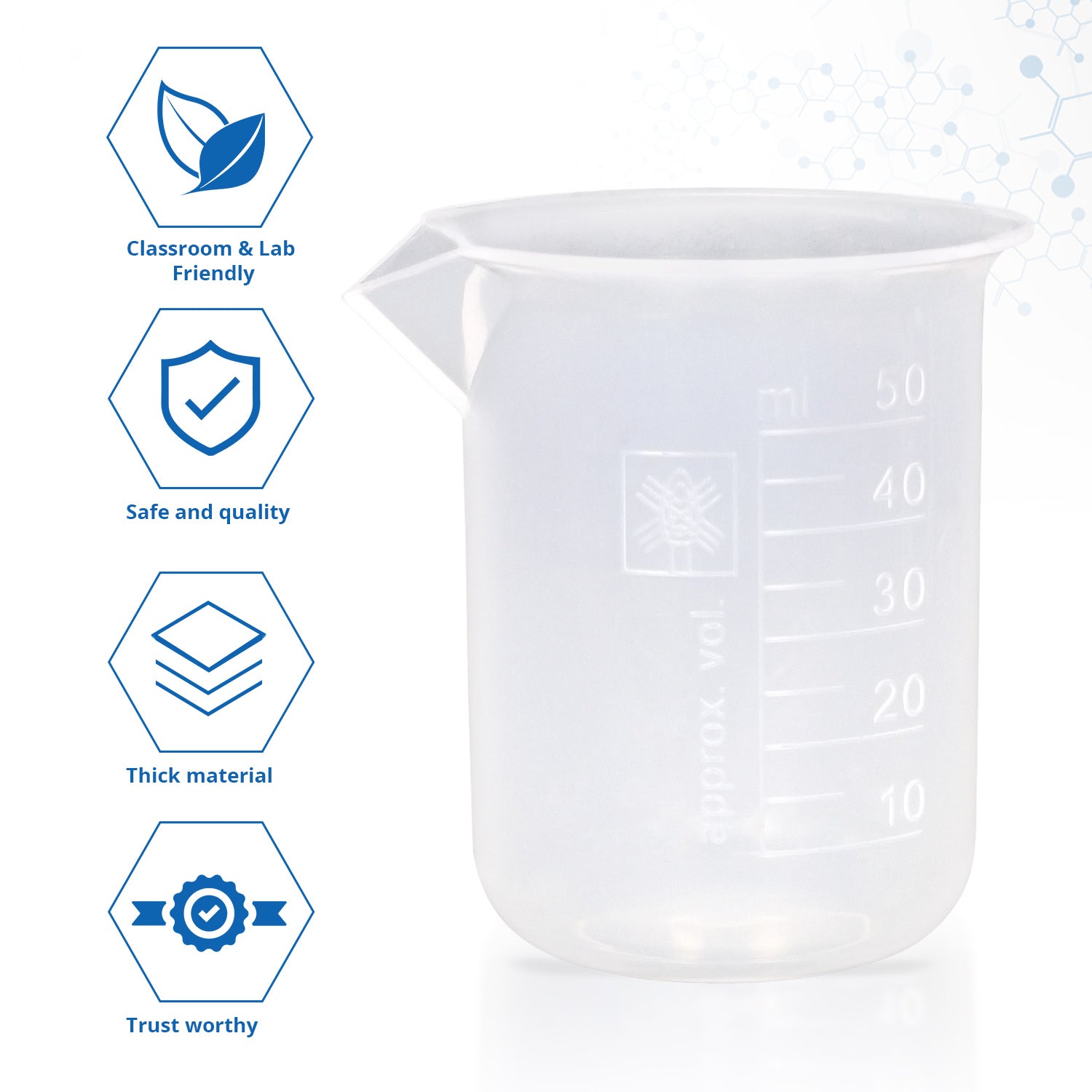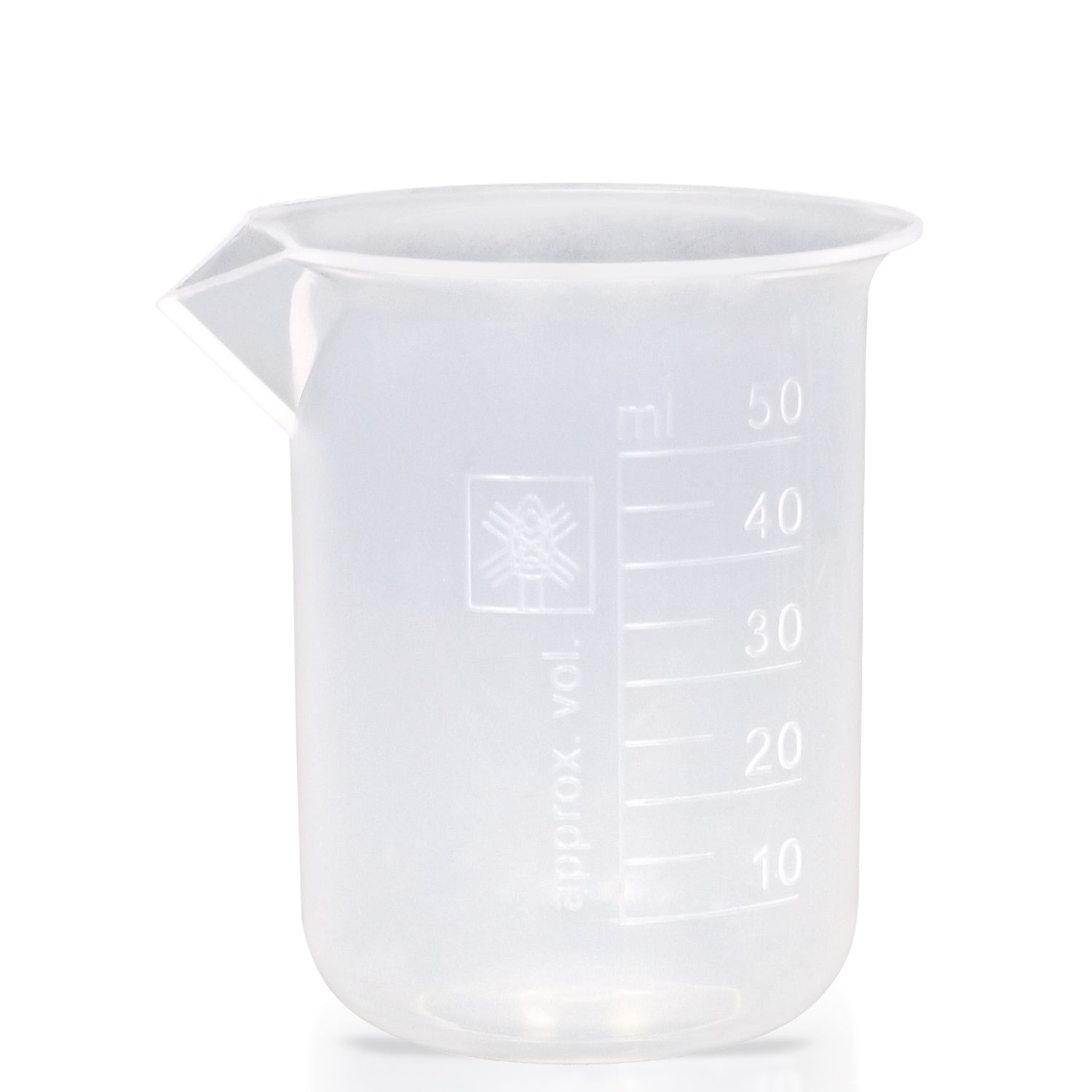 Beaker, Polypropylene, 50 ml. Griffin form. have excellent clarity and good chemical resistance, raised graduations on outer surface. With spout. Comes 12 beakers per pack.