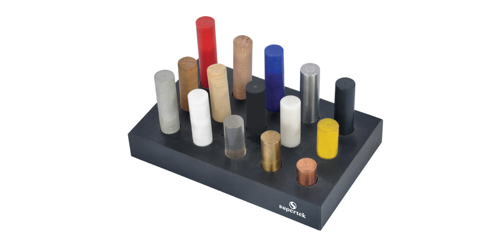 The set consists of specimens of 15 different types of materials. Students measure the mass, length and volume to determine the density of each of the materials. Set contains a sturdy storage base with one sample each of Walnut, Pine, Maple, Polypropylene, Polyethylene, Polyamide, Acrylic, Polyurethane, Phenolic, Polyvinylchloride, Delrin, Aluminum, Brass, and Copper. Samples are stamped with a letter code for easy identification. Instructions included. Part # PH10044