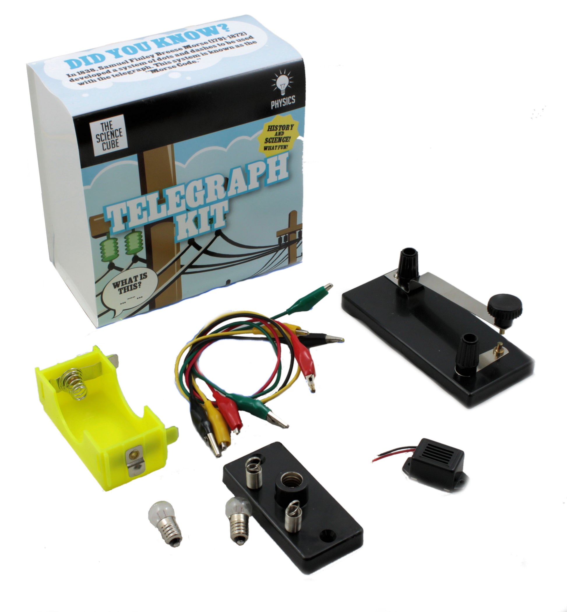 Discover how people communicated long distances before the telephone! With our Telegraph Kit, you can experience a little bit of history, learn Morse Code, and even send a secret message to a friend. Kit includes a D cell battery holder, contact key, light bulbs, alligator connector cords, buzzer, and exploration guide.
